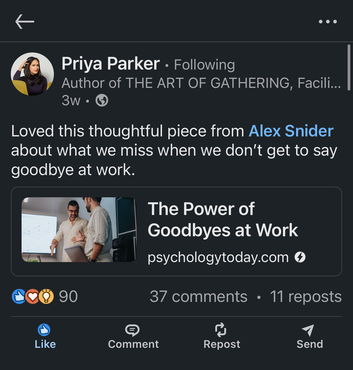 - I also had the pinch-me joy of having Priya Parker report an article I wrote on goodbyes at work.⬇️🤯