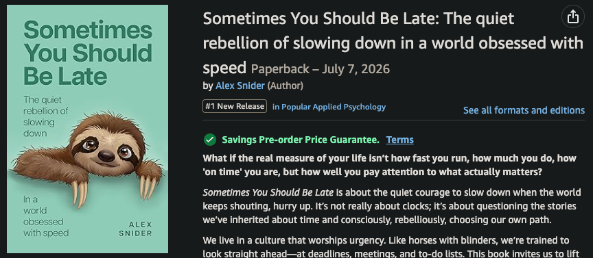 First, I’ve been so grateful for the response to pre-orders for Sometimes You Should Be Late! The book hit #1 as a new release in popular applied psychology. Wow! If you haven’t already, I hope you’ll consider pre-ordering! Link!