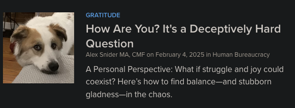 If you're anything like me, this is not an easy question to answer. I'm hoping my latest Psychology Today article serves in this time where it's hard to know how to feel. It's my take on how to find stubborn gladness—in the chaos.